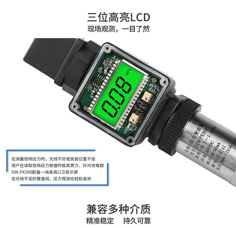 SIN-PX300型數顯壓力變送器采用無縫焊接結構,可批量化生產,經濟、可靠,具有良好的適應性,可應用于各種復雜的環境,該產品輸出形式多樣,壓力接口可提供定制,滿足您的使用需求。同時數顯壓力變送器帶有現場顯示功能,能夠更加直觀的顯示現場的壓力波動情況。廣泛應用于工業自動化設備配套以及石油、化工、冶金、電力等控制領域。