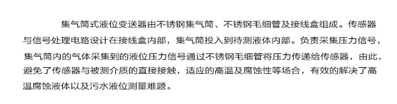 集氣桶式液位變送器(下稱變送器)用于測量較高溫度液體介質(zhì)的液位,原理是被測液體介質(zhì)壓縮集氣桶內(nèi)的空氣,空氣壓力通過毛細管傳遞給敏感元件,敏感元件本身不與被測介質(zhì)直接接觸,因此變送器可以應用在較高溫度的介質(zhì)環(huán)境中,同時,內(nèi)置微型信號放大處理電路,可以直接與計算機接口卡、控制儀表、智能儀表或 PLC 等連接,進行遠程傳輸。變送器廣泛應用于環(huán)保、水利、供水、工業(yè)過程控制、變頻供水等較高溫度介質(zhì)的液位測量。